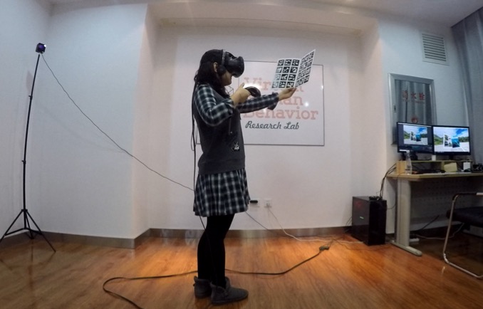 Virtual reality (VR) tracking systems and interaction designs have been widely developed and applied in industries and disciplines. However, only empirical studies could answer the most important questions about user’s engagement, enjoyment and learning outcomes. This study investigates whether the way the user interacts in a virtual environment impacts user behavior and user experience. We conducted a comparative experiment based on a VR reading application which provides three different ways of user interaction in a virtual environment: 1) interaction with motion controllers only; 2) interaction with the motion controller and VR Book ; 3) interaction with VR Book only. 30 Participants were divided into three groups and each group finished reading tasks in a VR environment with one of the three ways of interaction. Participants’ first-person view was screen recorded and participants’ behavior were video recorded. After the experiment, the sense of presence and reading efficacy was measured by a comprehensive questionnaire. The poster demonstrates the process of the experiment and the results of data analysis.